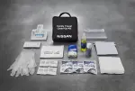 Basic cleaning supplies in a zippered nylon bag. Contents include: hand sanitizer- cleansing towelettes- clean-up wipes- plastic utility bags- paper scoop- plastic gloves- cold pack- air deodorizer- motion sickness bags- fabric cleaning wipes- cleaning brush- and tissues. Family travel clean up kit refill available. Refill For Family Travel Clean-up Kit.